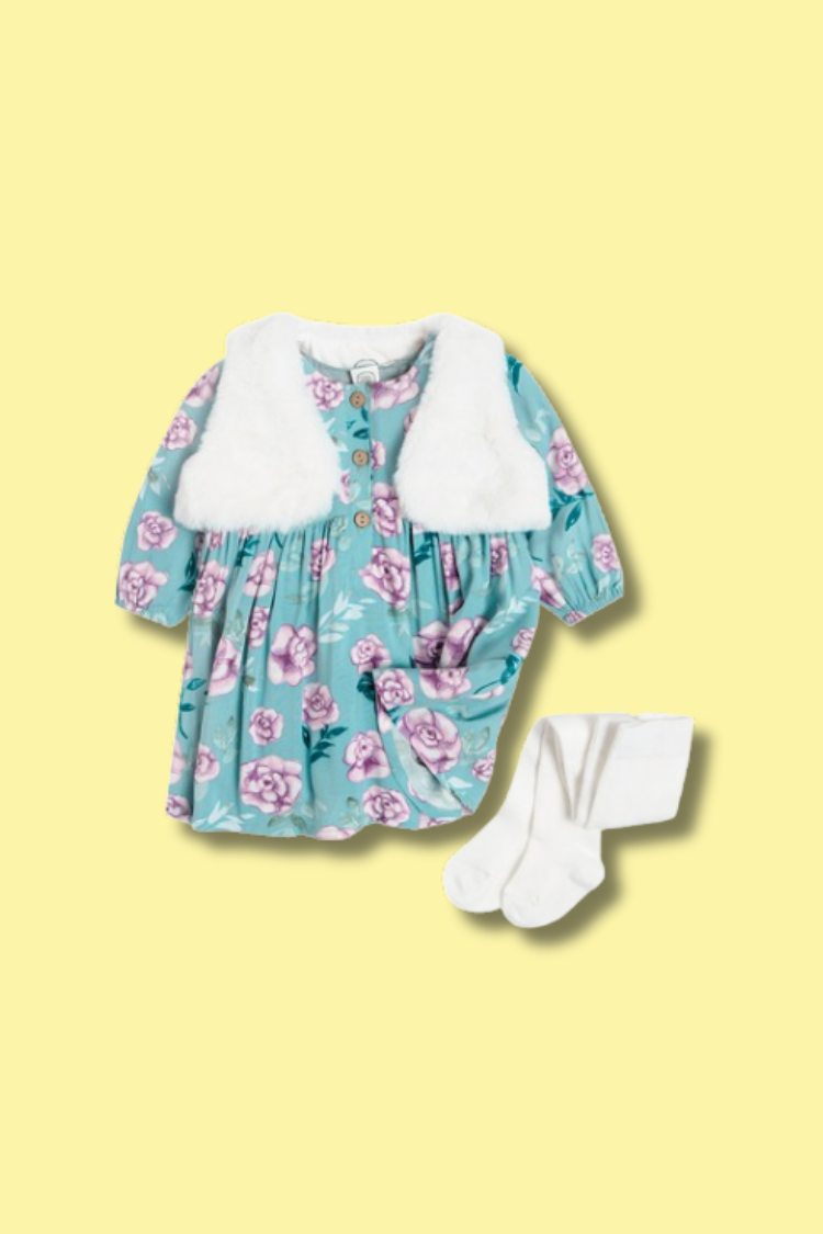 Ensemble 3 Pièces (Robe fleurie- Jilet – collant blanc)