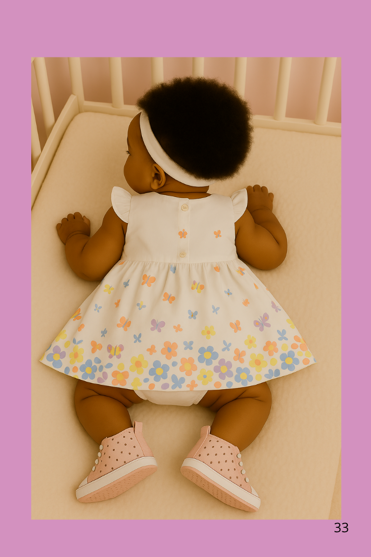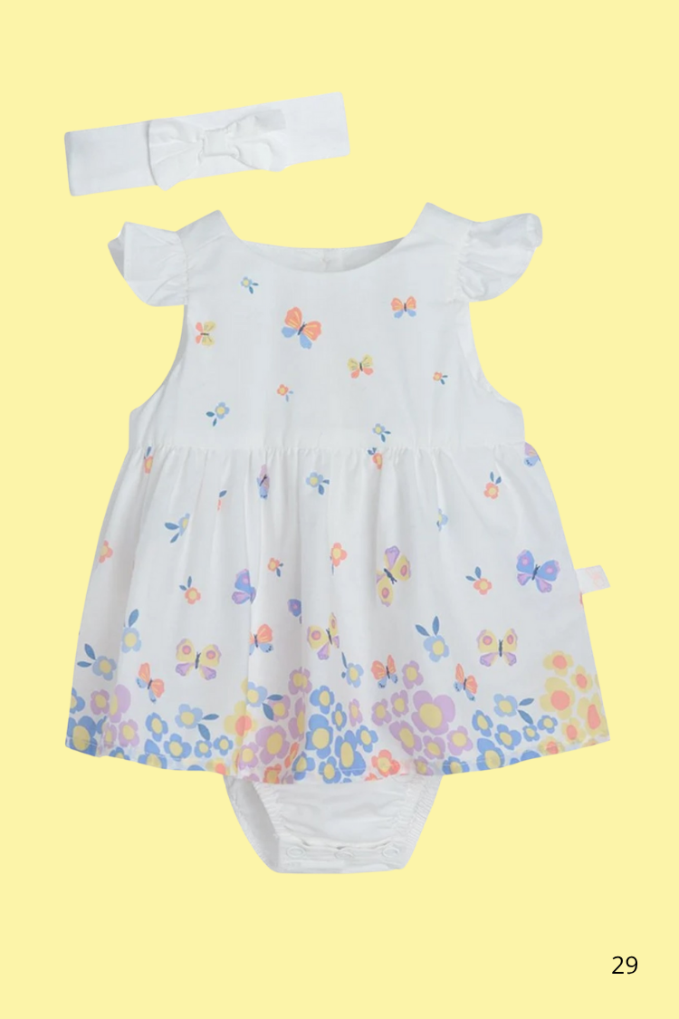 Le bandeau est orné d’un joli nœud à l’avant et doté d’un élastique à l’arrière pour un maintien parfait. Le body-robe en coton dispose d’un col rond, de mancherons volantés, de fronces délicates et d’une fermeture pratique avec boutons au dos et pressions à l’entrejambe pour un habillage facile.