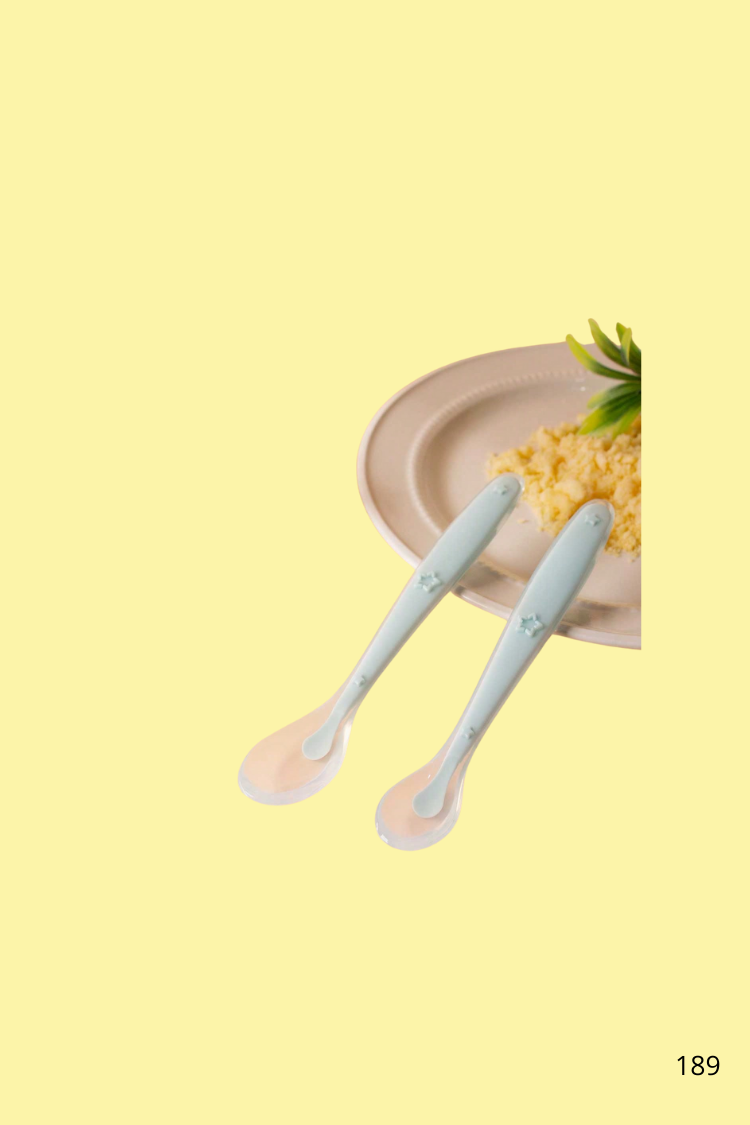 Ce lot de 2 cuillères en silicone vert clair est spécialement conçu pour les premiers repas de bébé. Leur embout souple et leur forme ergonomique les rendent parfaites pour les gencives sensibles et les petites bouches.