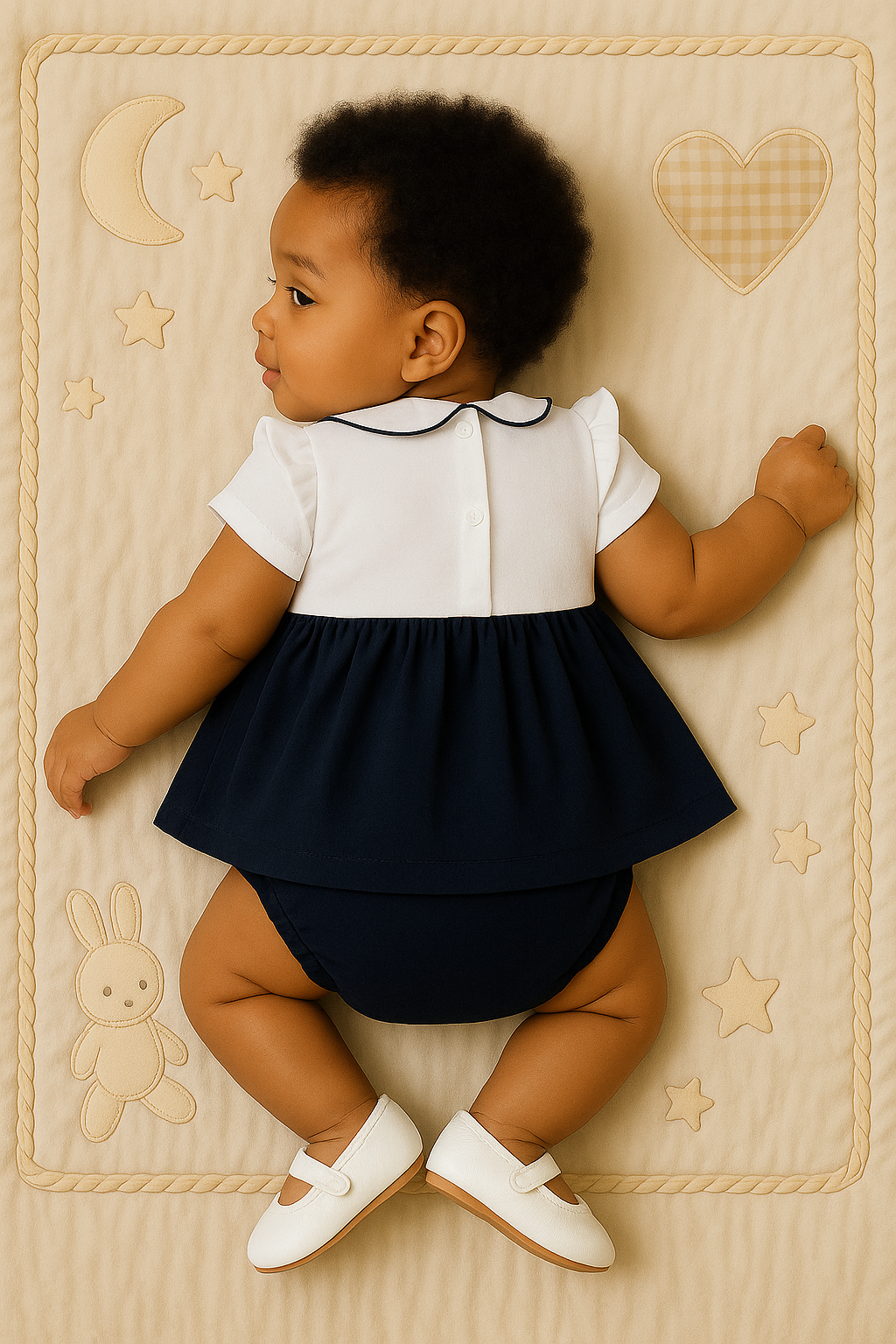 - Design : Haut blanc à manches courtes avec volants et col Claudine souligné d’un liseré bleu marine, jupe ample bleu marine pour un style chic et intemporel.
